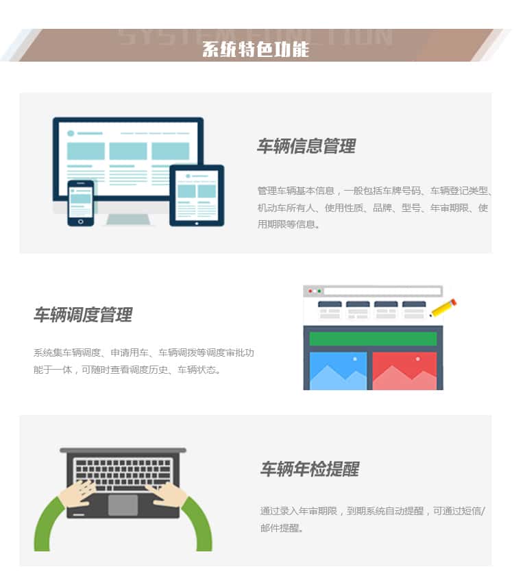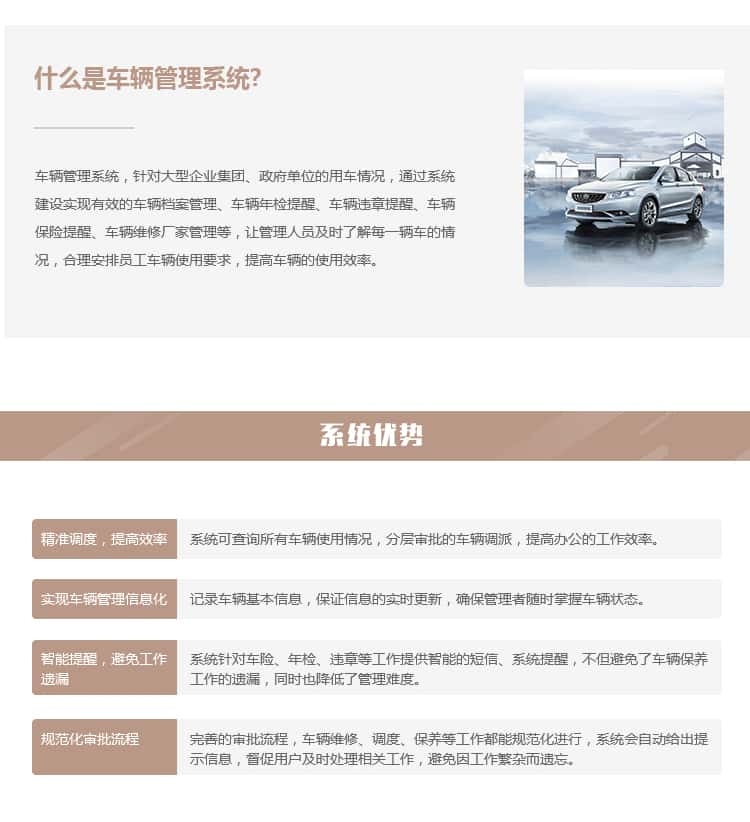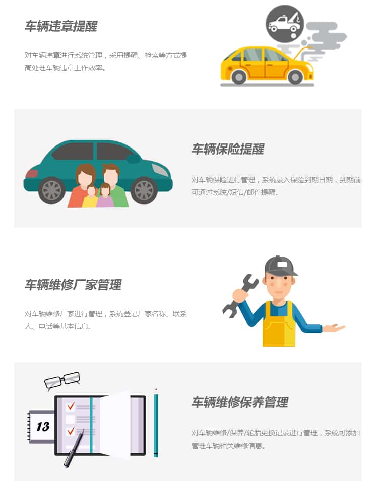 车辆管理系统,针对大型企业集团、政府单位的用车情况,通过系统建设实现有效的车辆档案管理、车辆年检提醒、车辆违章提醒、车辆保险提醒、车辆维修厂家管理等,让管理人员及时了解每一辆车的情况,合理安排员工车辆使用要求,提高车辆的使用效率。