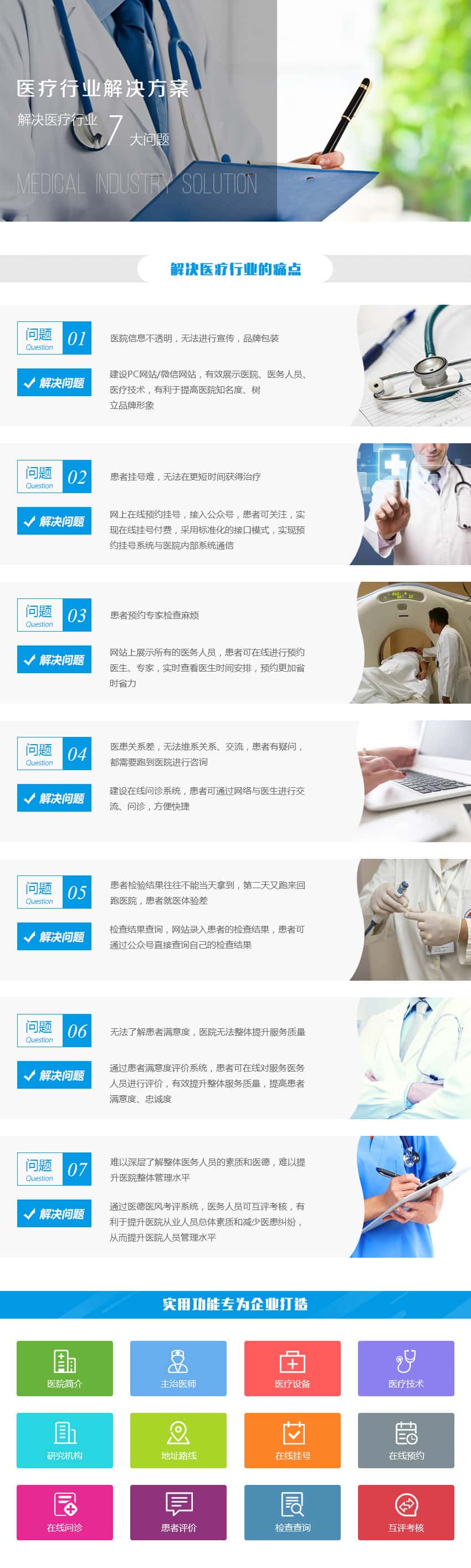 医院简介、主治医师、医疗设备、医疗技术、研究机构、地址线路、在线挂号系统、在线预约、在线问诊系统、患者评价系统、检查结果查询、互评考核系统